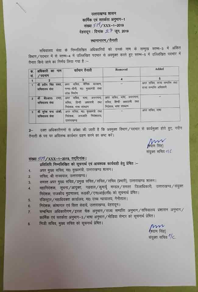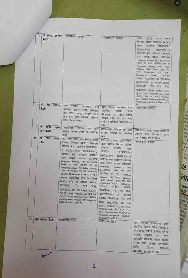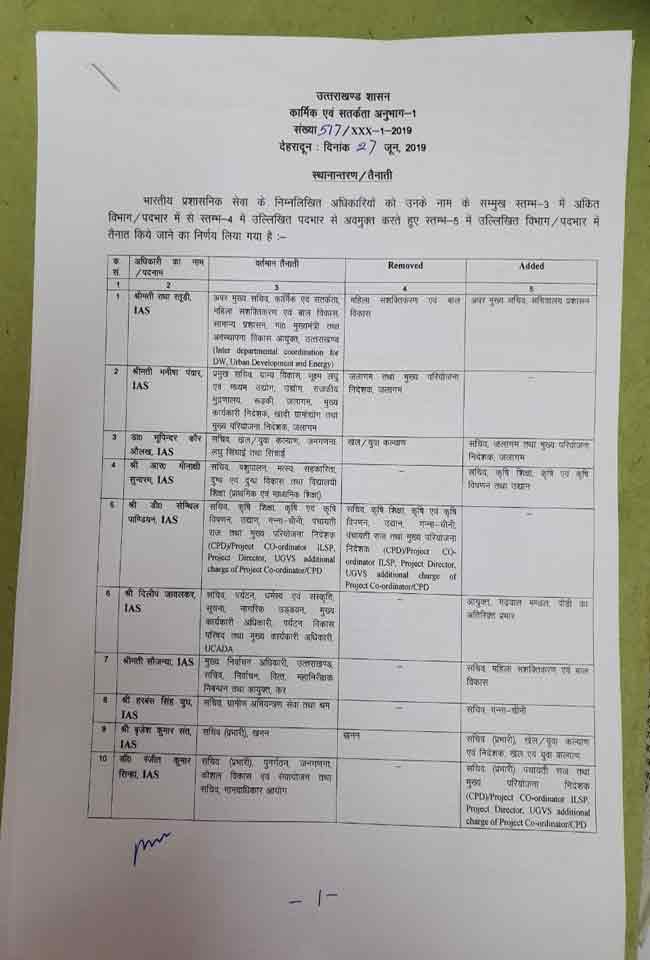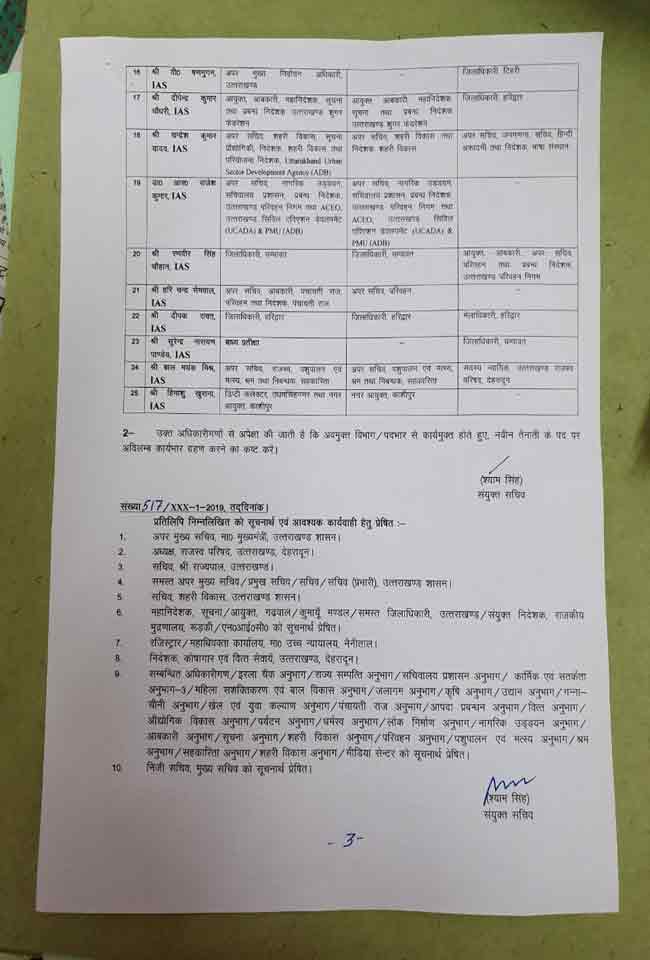इन्हें मिलाकर शासन ने 25 आइएएस, नौ पीसीएस और सचिवालय सेवा के तीन अधिकारियों के पदभार भी बदले गए हैं। इनमें अपर सचिव डॉ. मेहरबान सिंह बिष्ट को महानिदेशक सूचना का नया पदभार मिलना शामिल है।