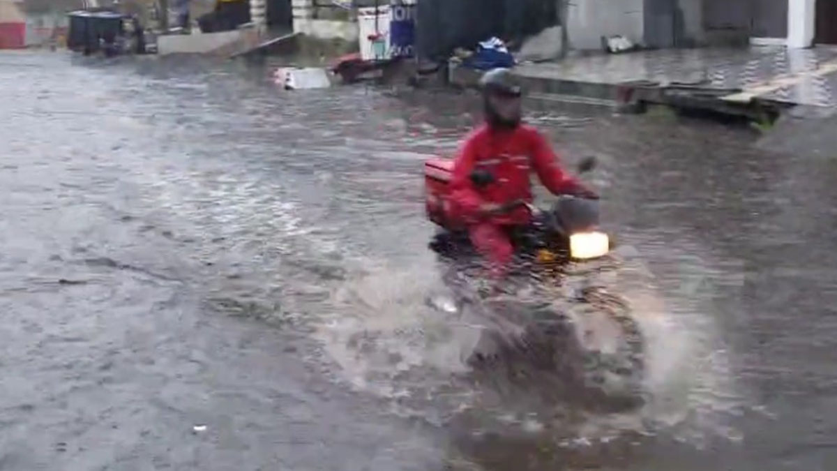 श्री शंकराचार्य चौक के पास जल भराव के बीच से गुजरता वाहन चालक। जागरण