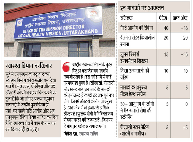 एनएचएम की स्थापना स्वास्थ्य सेवाओं को तकनीकि एवं वित्तीय सहयोग देने के लिए की थी। पर आज एनएचएम को अलग विभाग के रूप में चलाया जा रहा है। बकायदा, यहां आइएएस एवं पीसीएस अफसरों को कमान सौंपी गई तो अकादमिक तौर पर तेज-तर्रार माने जाने वाले डॉक्टरों को भी भारी जिम्मेदारियां दी गई। पर एनएचएम रैकिंग बताती है कि जिस उद्देश्य से इतने भारी भरकम महकमे का गठन किया गया है, वह उद्देश्य पूरा नहीं हो पाया है। यह चिंता उत्तराखंड जैसे छोटे हिमालयी राज्य में इसलिए भी बढ़ जाती है, क्योंकि यहां की विषम भौगोलकि परिस्थितियों के हिसाब से एनएचएम सरीखा महकमा बेहद कारगर हो सकता था। लेकिन हाल ये है कि आज स्वास्थ्य महानिदेशालय में एनएचएम के रूप में एक सामानांतर व्यवस्था चल रही है।