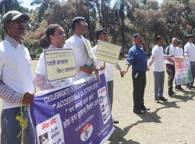 छात्रों ने देश बनेगा महान, सबसे पहले मतदान, पहले मतदान-फिर जलपान, जैसे कई नारे बुलंद किए। इसके बाद गांधी पार्क के भीतर दर्जनों की संख्या में दृष्टिबाधित छात्राओं ने मानव श्रृंखला बनाई। संस्थान के निदेशक नचिकेता राउत ने मतदान की अपील की। इस अवसर पर जन संपर्क अधिकारी योगेश अग्रवाल भी उपस्थित रहे।