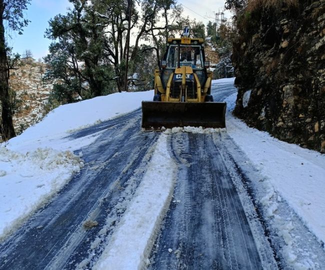 पहाड़ों पर बर्फबारी के बाद सड़क से बर्फ साफ करती जेसीबी।