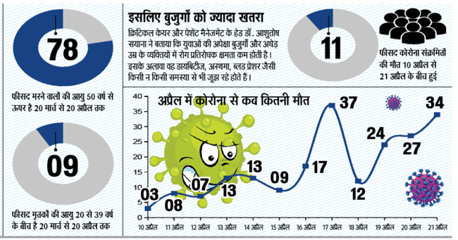 कोरोना की दूसरी लहर में संक्रमित होने वालों में बेशक युवा ज्यादा हैं पर यह बीमारी ज्यादा उम्र वालों के लिए काल बन रही है। पिछले एक माह की स्थिति देखें तो कोरोना संक्रमण के कारण मरने वालों में ज्यादातर 50 वर्ष या अधिक के लोग हैं।