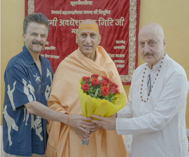 आचार्य महामंडलेश्वर स्वामी अवधेशानंद गिरी संग अभिनेता अनिल कपूर व अनुपम खेर। जागरण