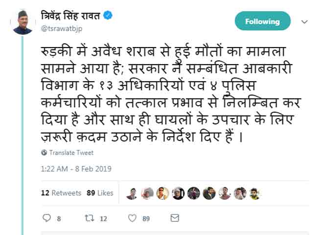 मुख्यमंत्री त्रिवेंद्र सिंह रावत ने कहा कि हरिद्वार जिले की रुड़की तहसील में शराब से हुई मौतों के मामले में आबकारी विभाग के 13 व पुलिस के चार अधिकारी-कर्मचारियों को तत्काल प्रभाव से निलंबित कर दिया गया है। घटना की मजिस्ट्रीयल जांच और मुख्य सचिव व डीजीपी को इस मामले में दोषी पाए जाने वालों पर शीघ्र कारवाई करने के निर्देश दिए गए हैं। महानिदेशक स्वास्थ्य व सीएमओ हरिद्वार को चिकित्सालयों में भर्ती लोगों को उचित चिकित्सा सुविधा उपलब्ध कराने के लिए निर्देशित कर दिया गया है। इस हृदय विदारक घटना में जान गंवाने वालों के प्रति मेरी संवेदना है।