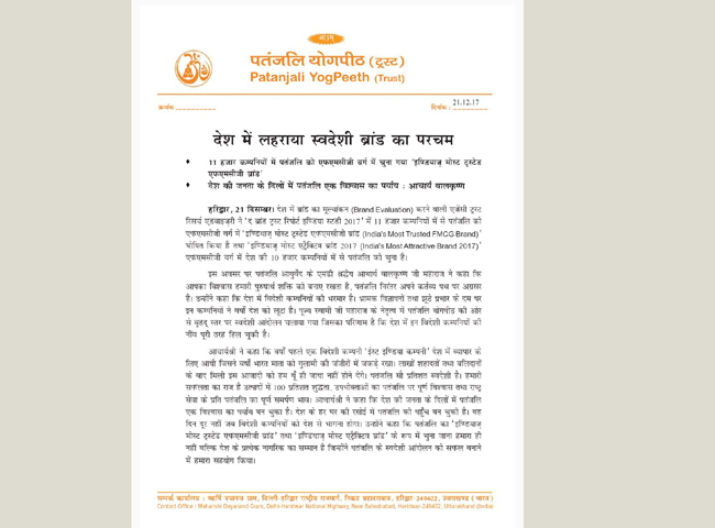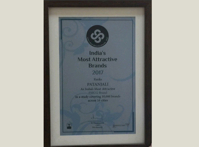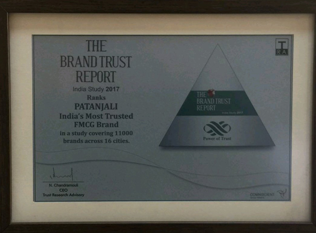 उन्होंने कहा कि पतंजलि को भारत के सबसे भरोसेमंद एफएमसीजी ब्रांड के रूप में स्थान दिया गया है, जिसमें द ब्रैंड ट्रस्ट रिपोर्ट इंडिया अध्ययन 2017 द्वारा 16 शहरों में 11000 ब्रांडों का अध्ययन किया गया है। उन्होंने कहा कि 10000 ब्रांडों के विश्लेषण के बाद पतंजलि को सबसे आकर्षक ब्रांड घोषित किया गया है।