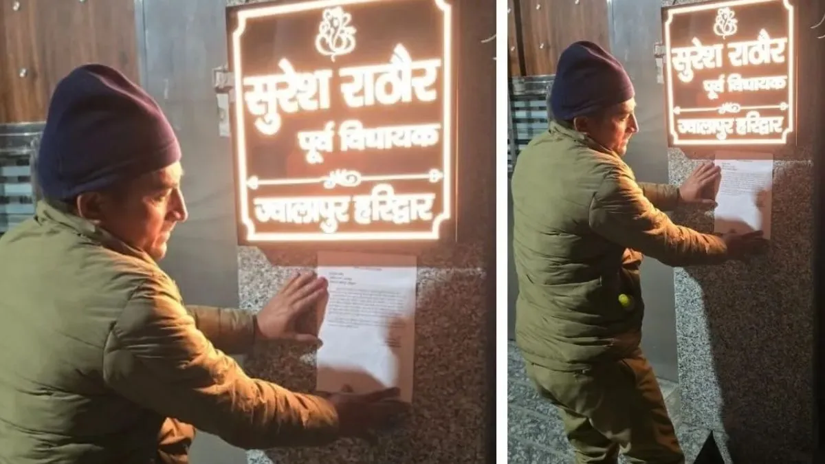 पुलिस ज्वालापुर पहुंचकर पूर्व विधायक के घर पर नोटिस चस्पा करती हुई।