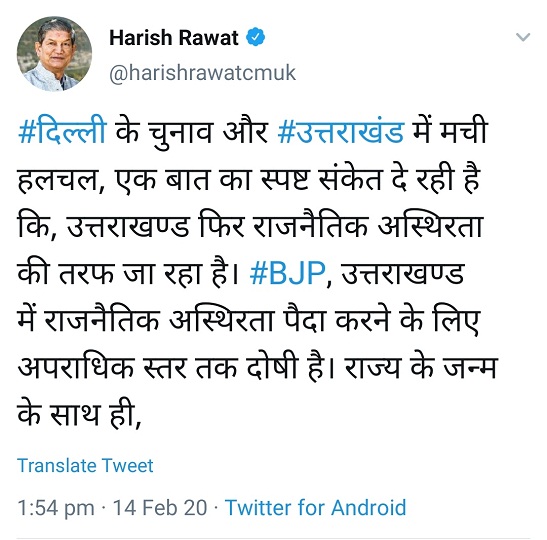 पूर्व सीएम हरीश रावत ने शुक्रवार को ट्वीट करते हुए कहा था दिल्ली चुनाव व उत्तराखंड में मची हलचल स्पष्ट संकेत दे रहा है कि उत्तराखण्ड फिर राजनीतिक अस्थिरता की तरफ जा रहा है। बीजेपी उत्तराखण्ड में राजनीतिक अस्थिरता पैदा करने के लिए अपराधिक स्तर तक दोषी है। राज्य के जन्म के साथ ही भाजपा ने उत्तराखंड में अस्थिरता को जन्म दिया। ऐसा लगता है अस्थिरता की लत भाजपा को इतनी गहरी लग चुकी है कि वो छूटे नहीं छूट रही है।