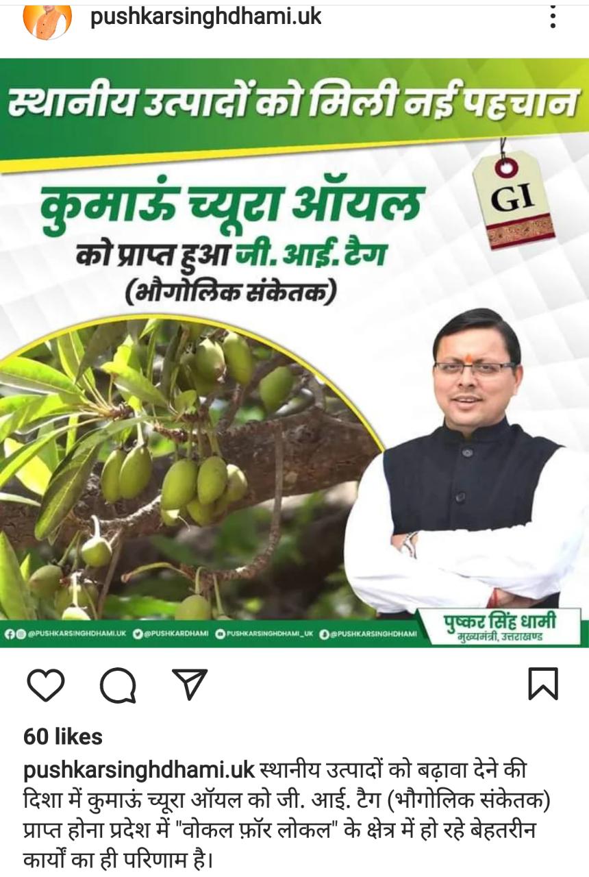 जागरण संवाददाता हल्द्वानी : : Chyura oil of Kumaon got GI tag : उत्तराखंड के कुमाऊं मंडल के पर्वतीय जिले में होने वाले च्यूरा के पेड़ निकलने वाले आयल (Chyura oil) को भौगोलिक संकेतक (GI Tag) मिला है। सीएम पुष्कर सिंह धामी ने ट्वीट कर इसकी जानकारी दी है। औषधीय गुणों से भरपूर अब च्यूरा आयल की डिमांड बढ़ने के साथ उत्पादकों को भी आर्थिक लाभ होगा।