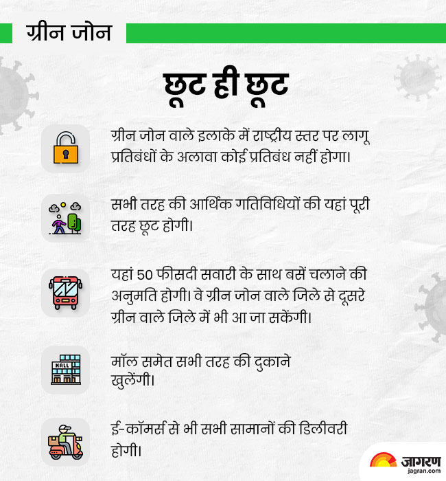 -ग्रीन जोन वाले इलाके में राष्ट्रीय स्तर पर लागू प्रतिबंधों के अलावा कोई प्रतिबंध नहीं होगा।