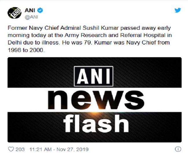 1965 व 1971 में पाकिस्तान से युद्ध लड़ चुके पूर्व नेवी चीफ एडमिरल सुशील कुमार का दिल्ली में निधन हो गया। रिटायरमेंट के बाद से वे भवाली में रह रहे थे।