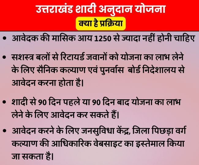 नैनीताल जिले में इस योजना से 322 लोगों को लाभ हुआ। बेटियों के विदाई के समय यह धनराशि दी जा चुकी है। राज्य में निराश्रित विधवाओं की पुत्रियों के विवाह के लिए अनुदान योजना के तहत 50 हजार रुपये दिए जाते हैं। इस श्रेणी में अनुसूचित जाति, जनजाति व सामान्य श्रेणी को रखा गया है। सशस्त्र बलों से सेवानिवृत पूर्व सैनिक की बेटी की शादी भी अनुदान योजना शामिल है।