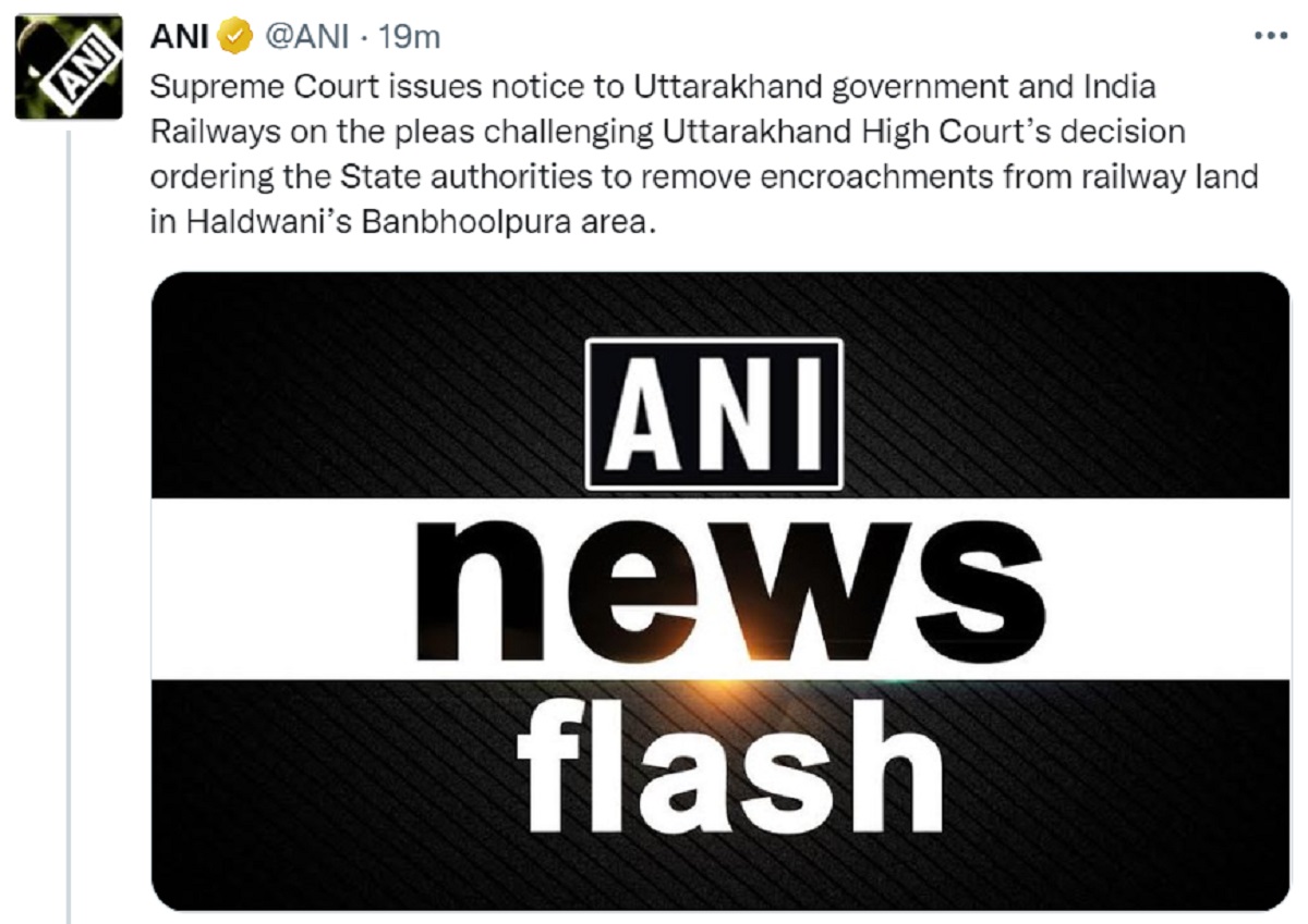 उत्तराखंड के फैसले के खिलाफ सुप्रीम कोर्ट में याचिका दायर की गई थी। सुप्रीम कोर्ट ने उत्तराखंड सरकार और भारतीय रेलवे को नोटिस जारी कर जवाब मांगा है। वकील लुबना नाज ने बताया कि सुप्रीम कोर्ट ने सुनवाई के दौरान कहा कि उस जमीन पर कोई निर्माण नहीं होगा। पुनर्वास योजना को ध्यान में रखा जाना चाहिए। स्कूल, कॉलेज और अन्य ठोस ढांचे हैं, जिन्हें इस तरह नहीं गिराया जा सकता है।