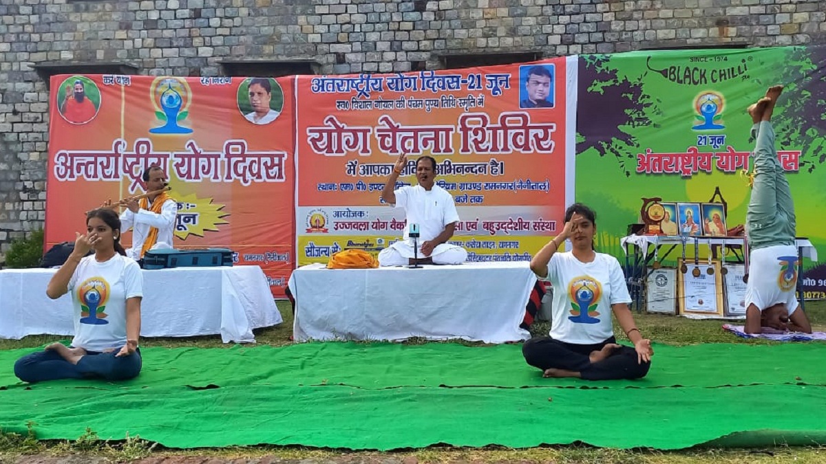 रामनगर के एमपी इंटर कालेज परिसर में लोगों के साथ योग करते विधायक दीवान सिंह बिष्ट।