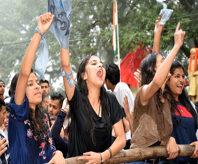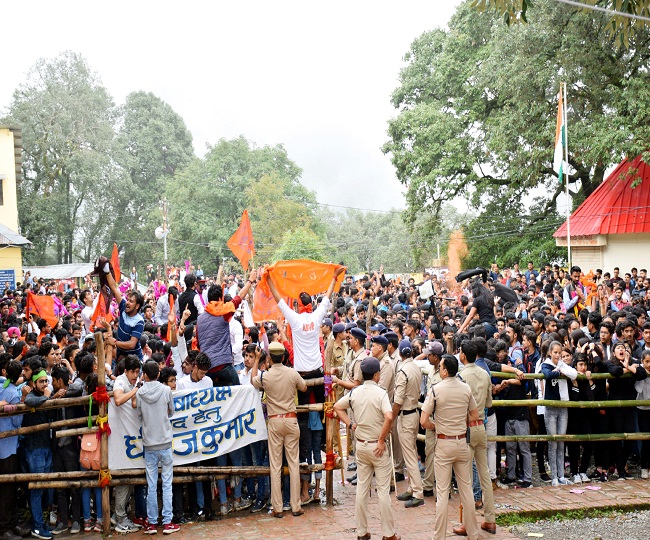नैनीताल : डीएसबी परिसर में गैदरिंग में समर्थकों का जोश देखने लायक था। प्रतिद्वंद्वी को नीचा दिखाने के लिए समर्थकों ने झंडे लहराते हुए खूब हो-हल्ला किया। इसी दौरान एक लाठी से छात्रा को चोट लग गई, तो दो गुट भिड़ गए। मामला बढ़ा तो एसओ राहुल राठी समेत भारी पुलिस फोर्स ने मोर्चा संभालकर दोनों ओर के समर्थकों को रोका।