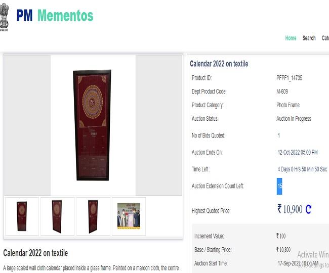 यह ऑनलाइन नीलामी प्रधानमंत्री मोदी के जन्मदिन 17 सितंबर को शुरू हुई थी और 12 अक्टूबर तक चलेगी। वेबसाइट https://pmmementos.gov.in पर पंजीकरण कराकर इस आॅलाइन नीलामी में शामिल हुआ जा सकता है, जहां कुमाऊं की ऐपण कलाकृति के अलावा मृर्तिकार अरुण योगीराज की बनाई नेताजी सुभाष चंद्र बोस की प्रतिमा और राष्ट्रमंडल खेलों के विजेताओं की ओर से पीएम को दिए गए उपहार भी शामिल हैं। फिलहाल 1219 उपहारों को इस नीलामी के लिए सूचीबद्ध किया गया है।