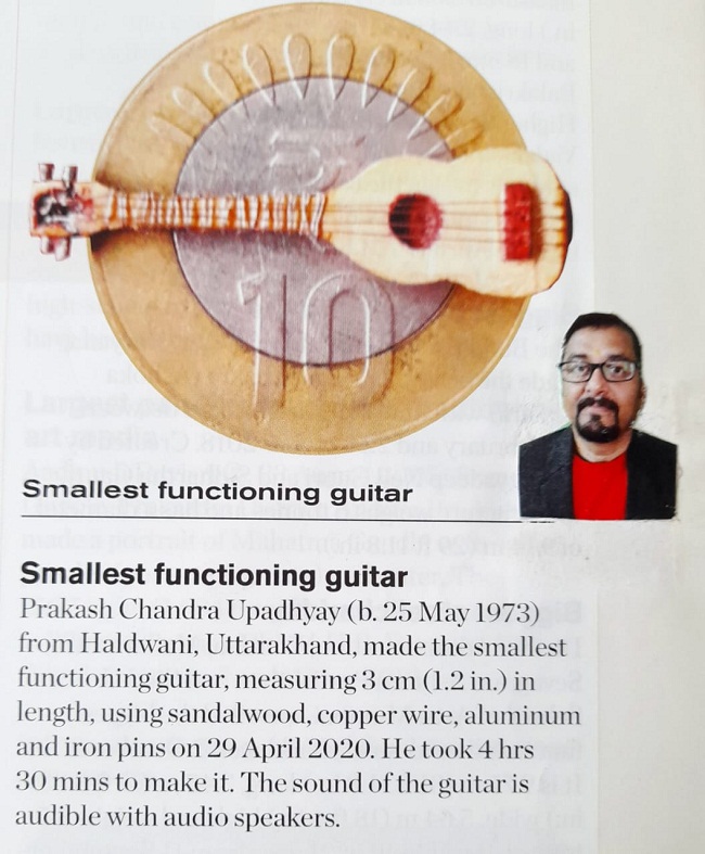 प्रकाश चन्द्र उपाध्याय ने सिर्फ तीन सेन्टीमीटर लंबा गिटार बनाकर व्यक्तिगत श्रेणी में विश्व रिकॉर्ड बनाया है । गिटार को चन्दन की लकड़ी, तांबे, एल्यूमुनियम के तार व पिन से तैयार किया गया है । गिटार की आवाज को माइक के माध्यम से अच्छे से सुना जा सकता है । जिसको मात्र 4 घंटा 30 मिनट में 29 अप्रैल 2020 को बनाया है। इसे लिम्का बुक ऑफ रिकार्ड 2021-22 मे दर्ज कर किया गया है।