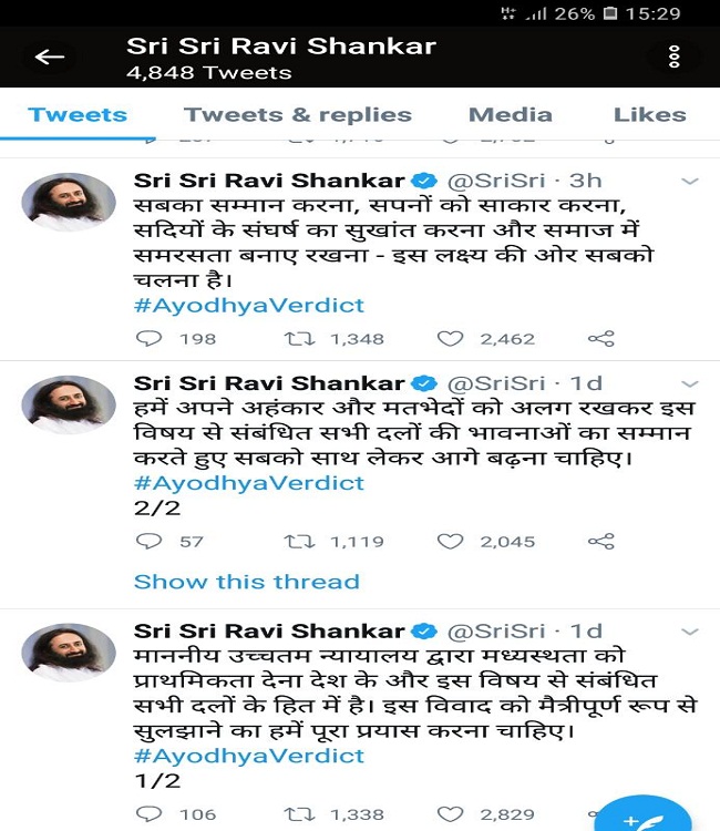 वहीं श्री श्री इसी बीच अपने पूर्व निर्धारित कार्यक्रम के अनुसार हल्द्वानी पहुंचे हैं। इस दौरन उन्होंने पत्रकारों को संबोधित करते हुए कहा कि मध्यस्थता कमेटी में शामिल होने की जानकारी अभी-अभी प्राप्त हुई है। रामजन्मभूमि विवाद को अपने स्तर से सुलझाने के लिए हर संभव कोशिश करूंगा। उम्मीद है इसका समाधान जरूर निकलेगा। इस दौरान उन्हें कमेटी में रखने पर हो रही राजनीति पर सवाल पूछने पर श्री श्री ने कहा कि राजनीति करना राजनीतिक दलों का काम है। ये सवाल आप लोग उन्हीं लोगों से पूछिए।