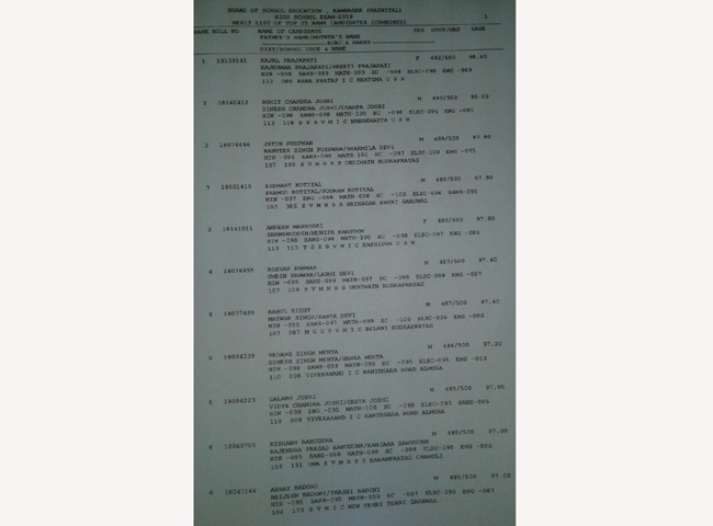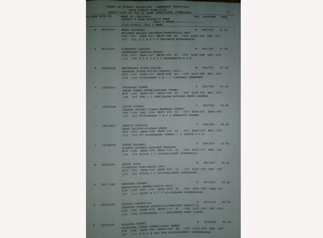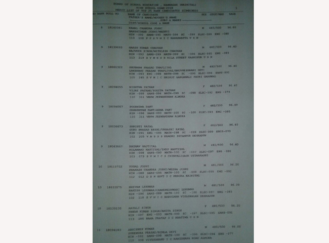 परिषद के सभापति आरके कुंवर सुबह 11 बजे रिजल्ट घोषित करते हुए बताया कि हाईस्कूल परीक्षा में वरीयता सूची में पीपीएसएम इंटर कालेज नानकमत्ता (ऊधमसिंह नगर) के रोहित जोशी ने 98 प्रतिशत अंक प्राप्त कर दूसरा स्थान प्राप्त किया है। एसवीएमएचएसएस कालेज ऊखीमठ (रूद्रप्रयाग) के जतिन पुष्पवाण, एसवीएचएचएसएस कालेज श्रीनगर (पौड़ी) के सिद्धांत कोटियाल व बीवीएमआइसी कालेज, काशीपुर(ऊधमसिंहनगर) की अमरीन मन्सूरी ने 97.80 अंक लेकर तीसरे स्थान हासिल किया।