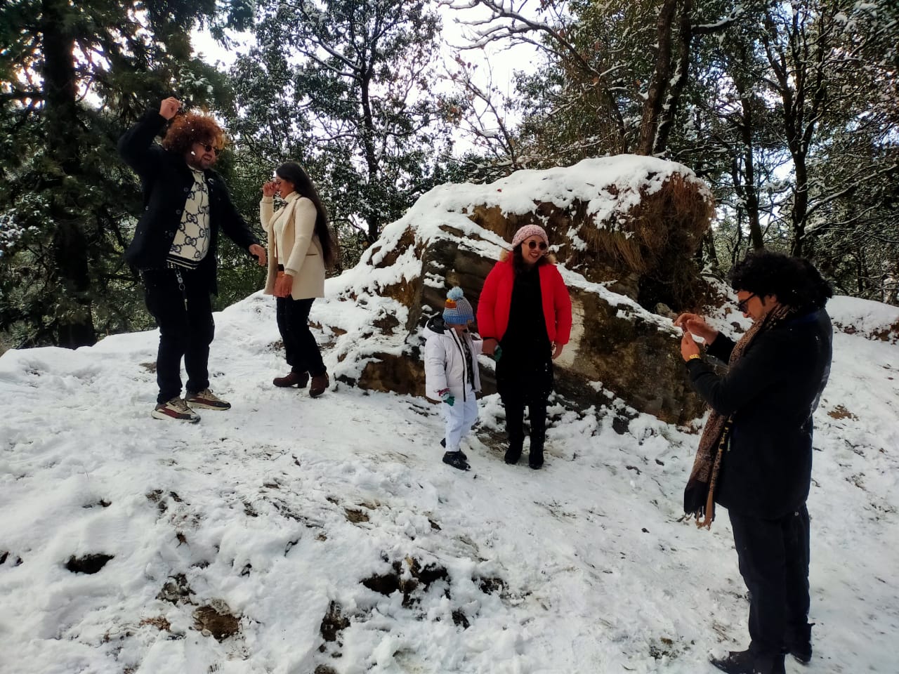 नैनीताल में बर्फबारी का मजा लेते हुए पर्यटक।