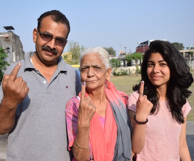 बरेली रोड स्तिथ लक्ष्मी शिशु मंदिर स्कूल पोलिंग बूथ पर वोट डालने के बाद अंगुली पर लगा निशान दिखाती तीन पीढि़यां एक साथ। दादी कमलेश बग्गा , पिता संजय बग्गा और बेटी दृष्टि बग्गा।