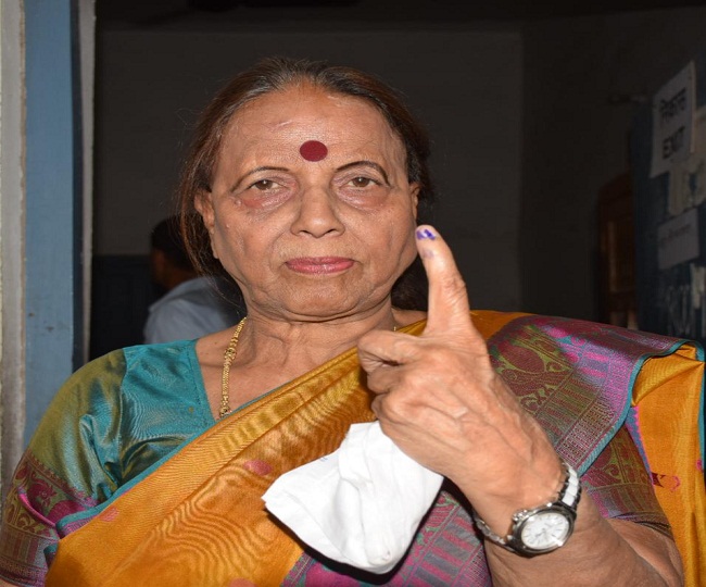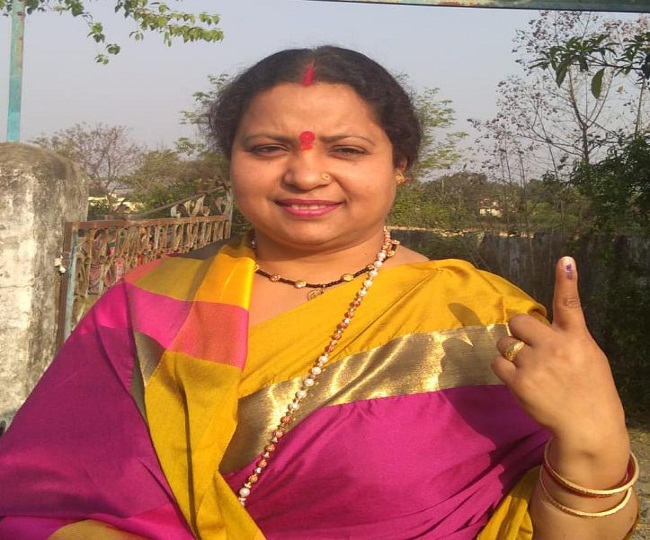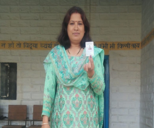 देवाल चौड़ स्थित बूथ में मतदान करने के बाद निशान दिखाती जिला पंचायत अध्यक्ष सुमित्रा प्रसाद।