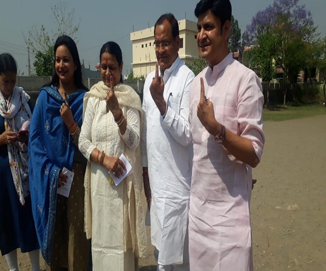 राजकीय उच्च प्राथमिक विद्यालय में वोट देने के लिए पहुंचे परिवहन मंत्री यशपाल आर्य विधायक संजीव आर्य उनकी पत्नी पुष्पा आर्य व बहू रेखा विश्वकर्मा।