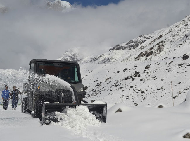 केदारनाथ में रास्ते से बर्फ हटाते निम के श्रमिक।