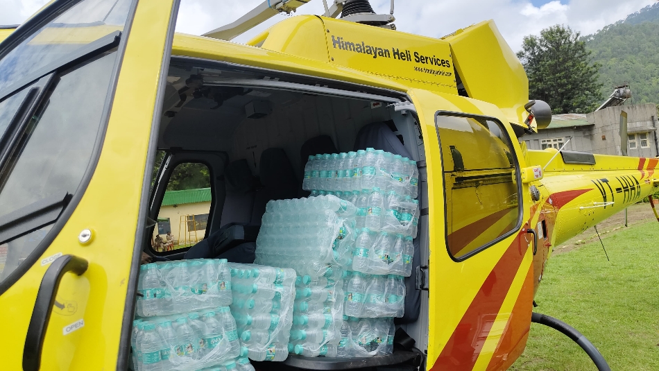 मंगलवार को मौसम खुलने पर मातली हेलीपैड से आपदा प्रभावित क्षेत्र में भेजा गया पानी। स्रोत सूचना विभाग