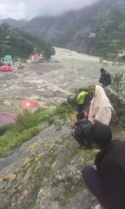 खीर गंगा नदी में बढ़े जलस्तर से बचाव को ऊंचाई पर बैठे ग्रामीण। वीडियो ग्रैब