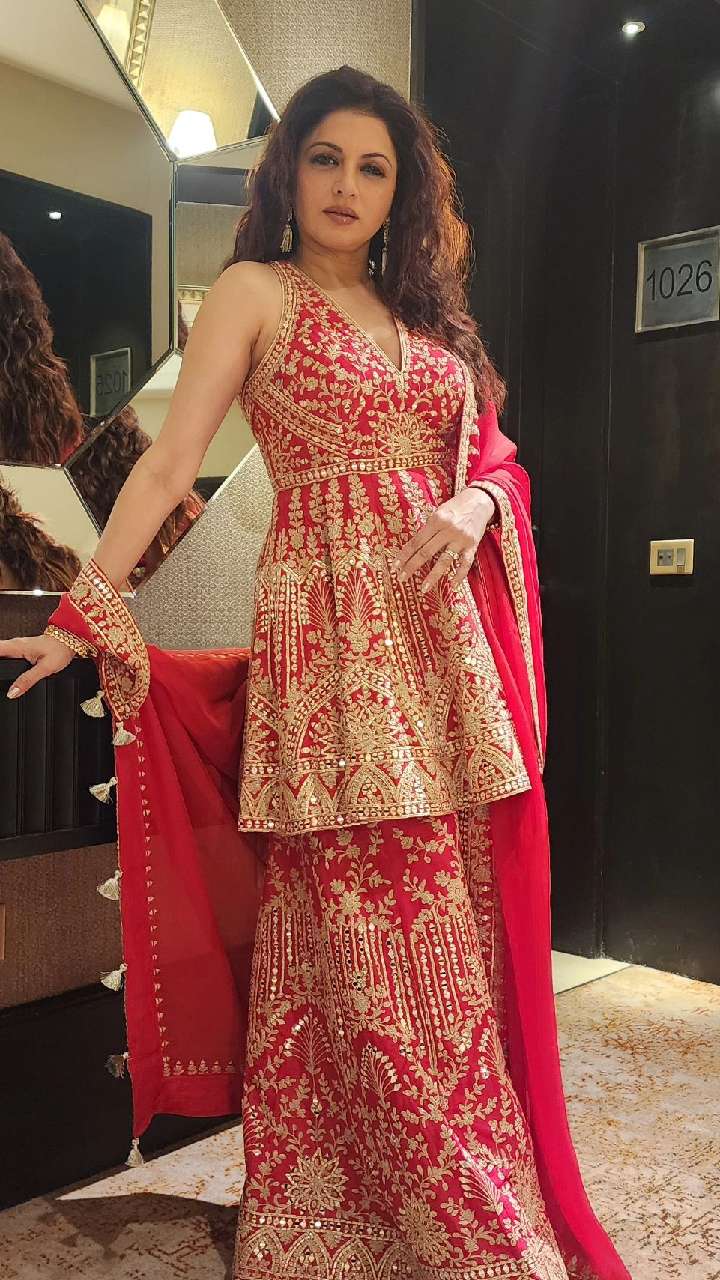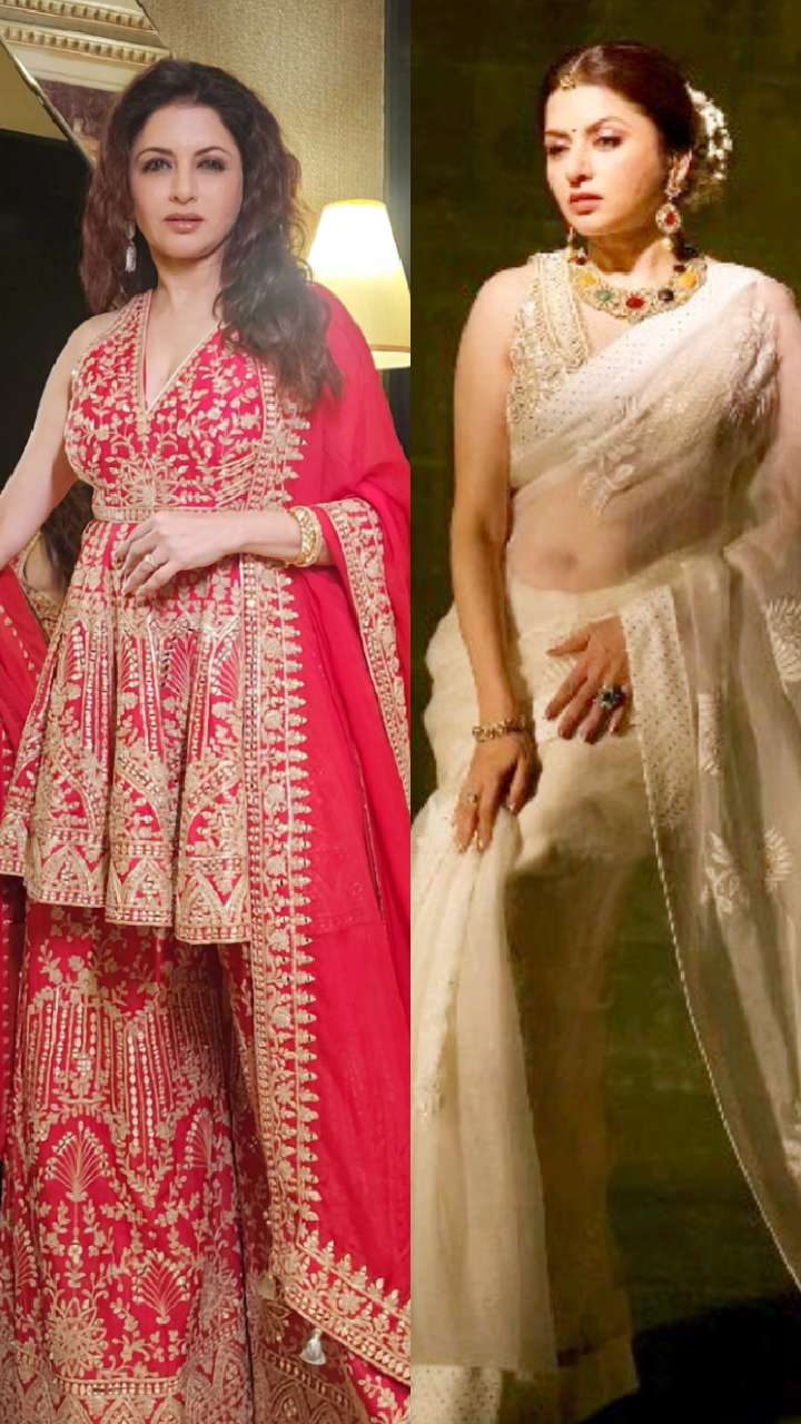 वेडिंग सीजन में इन दिनों शरारा सूट का खूब फैशन है। ऐसे में आप भाग्यश्री के इस गोल्डन हेवी वर्क शरारा सूट को कॉपी कर सकती हैं।