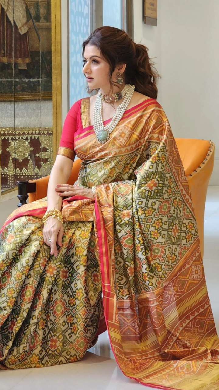 इस तरह की चुंदरी प्रिंट साड़ी के साथ पर्ल नेकपीस आपके लुक को रॉयल बना देगा। इसके साथ डीवा की कर्ली हेयर पौनी काफी जंच रही है।