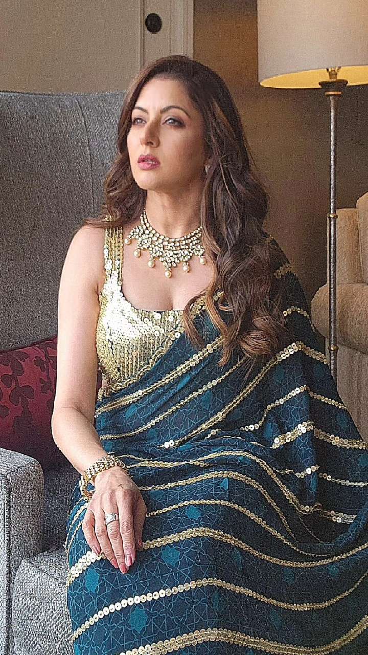 सेक्विन साड़ी भी वेडिंग में काफी गॉर्जियस लुक देती हैं। अभिनेत्री ने टील ग्रीन सेक्विन साड़ी के साथ गोल्डन कट स्लीव्स ब्लाउज पहना हुआ है।