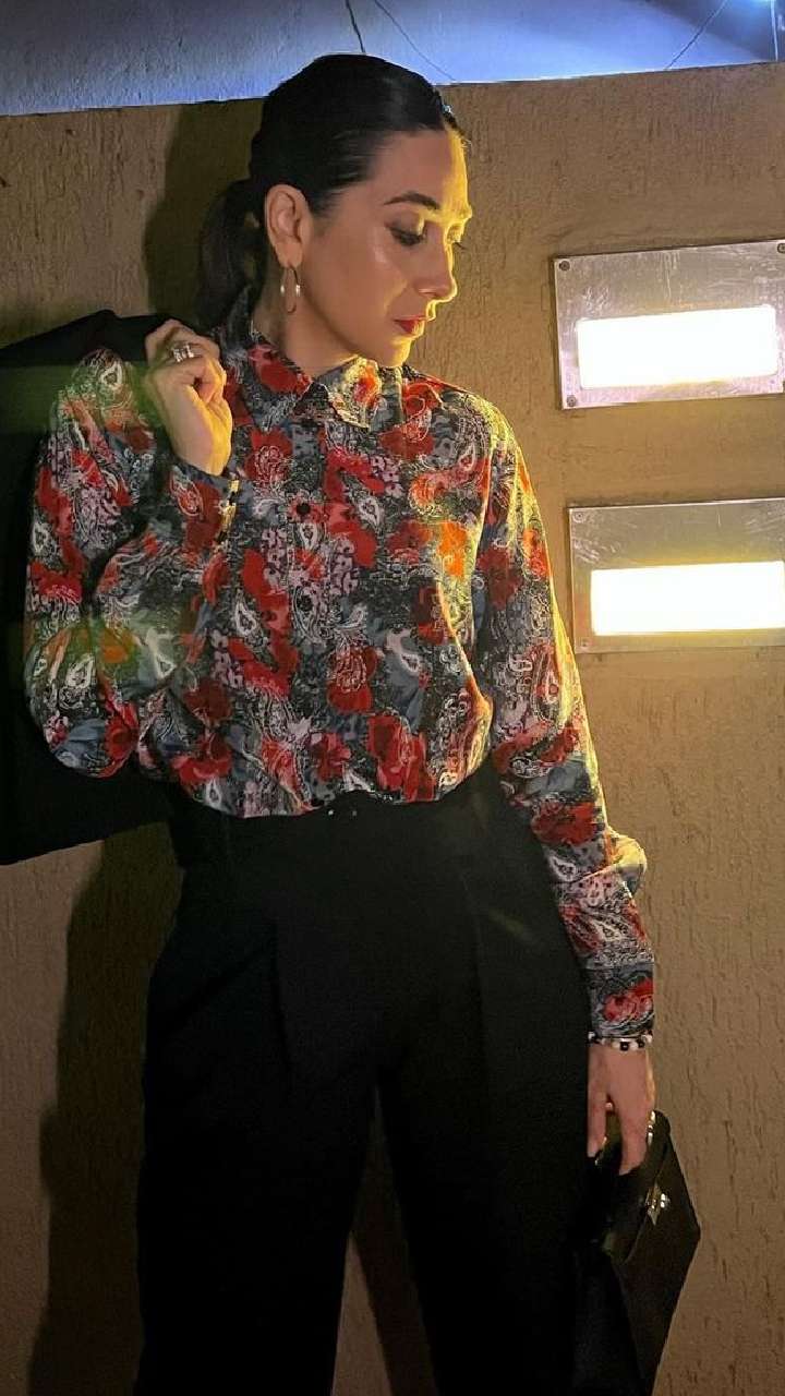 करिश्मा का ये फॉर्मल फ्लोरल प्रिंट शर्ट और ट्राउज़र लुक एलिगेंट लुक दे रहा है।