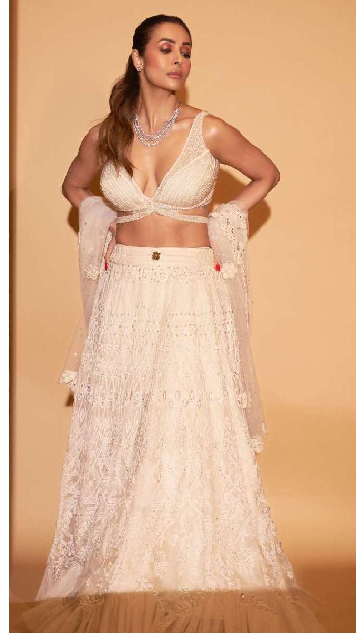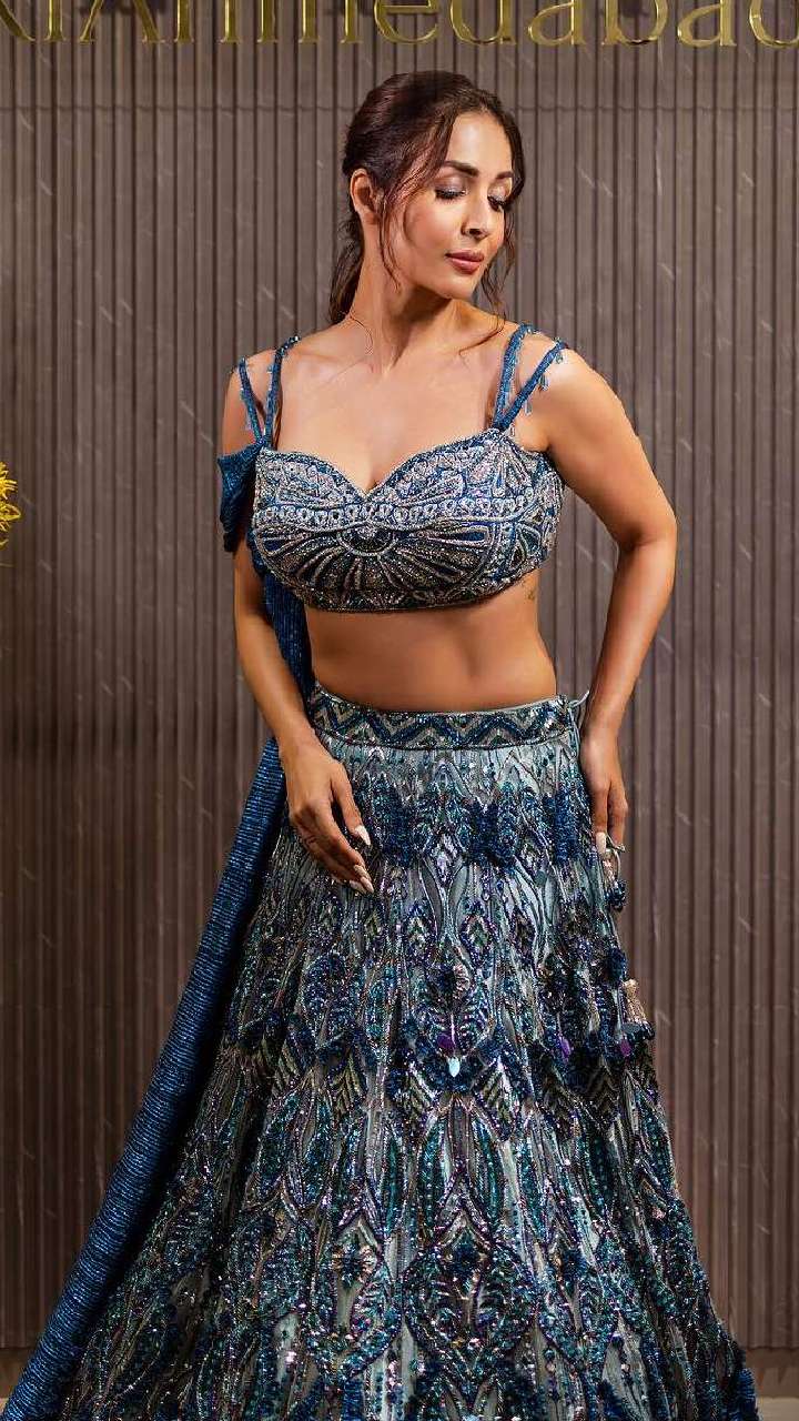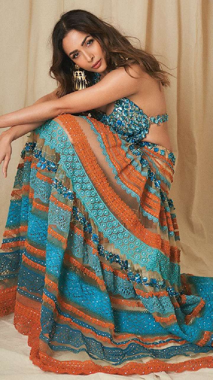 मलाइका मल्टीकलर स्ट्रिप ट्रांसपेरेंट लहंगे बेकलेस ग्लिटरी चोली में काफी अट्रैक्टिव लग रही हैं। आप ऐसे लहंगे बनवा भी सकती हैं।