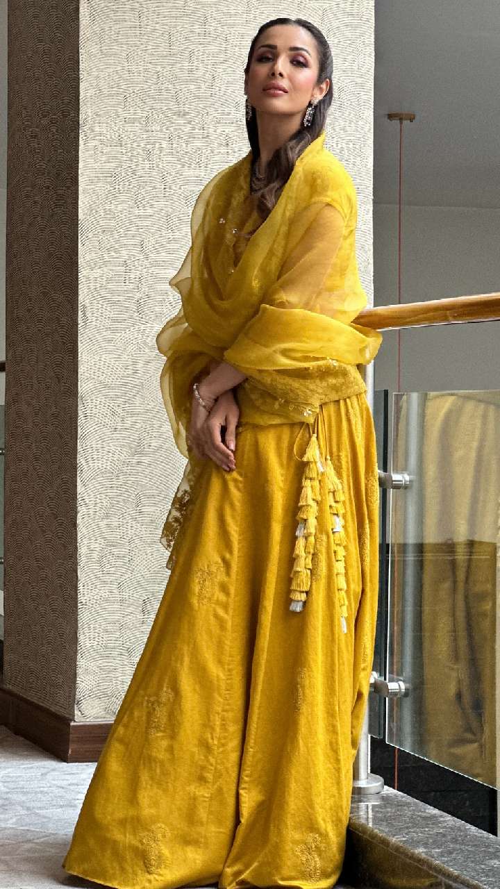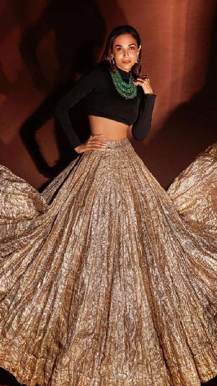 यंग गर्ल्स मलाइका के गोल्डन शिमरी लहंगे प्लेन ब्लैक फुल स्लीव्स चोली को कॉपी कर सकती हैं। इसके साथ मल्टीलेयर नेकपीस काफी सूट कर रहा है।