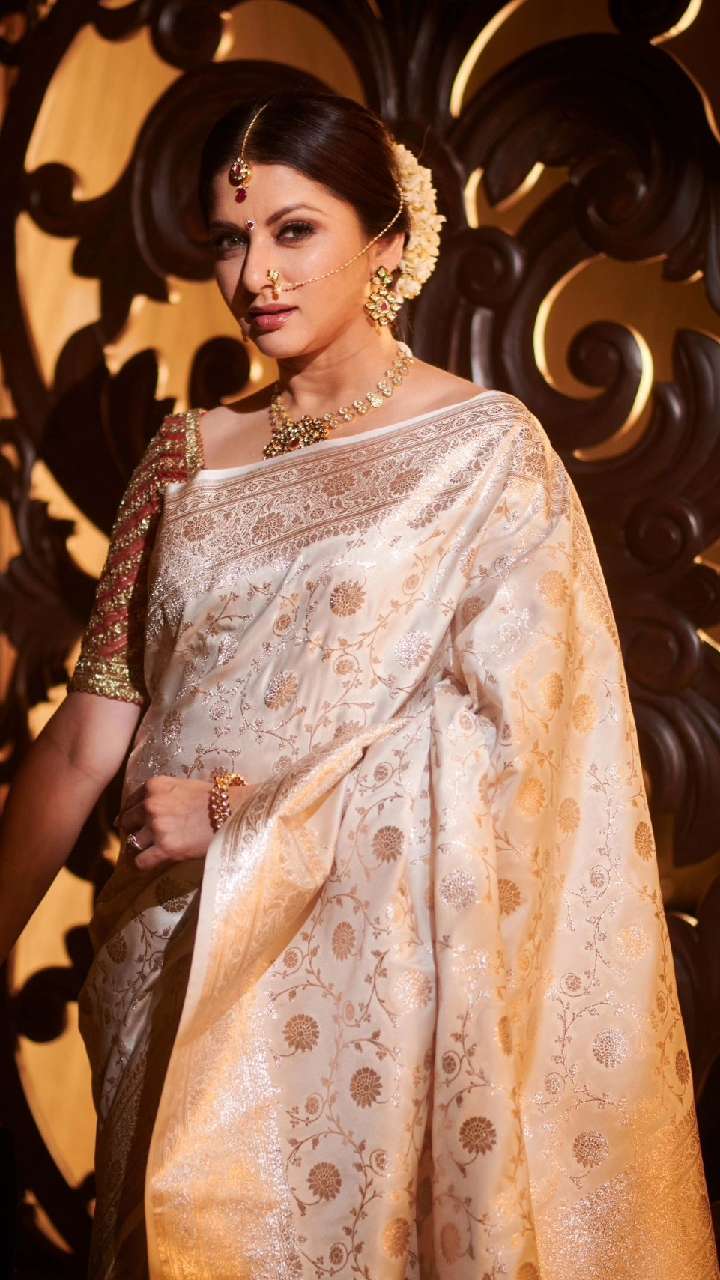 इस हाल में अभिनेत्री ने व्हाइट गोल्डन कलर के जरी वर्क वाली शाइनी साड़ी में अपना प्रिटी लुक शेयर किया है। इसके साथ नथ और बालों में गजरा बना हेयर स्टाइल से अपना लुक कंप्लीट किया है।