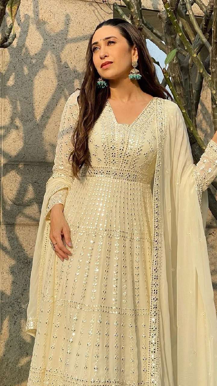 व्हाइट कलर के अनारकली मिरर वर्क सूट में एक्ट्रेस बेहद खूबसूरत लग रही हैं। ये सूट हर उम्र की महिलाओं पर जचेगा।