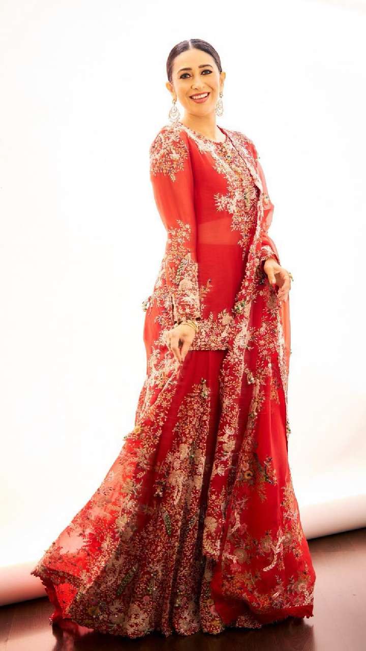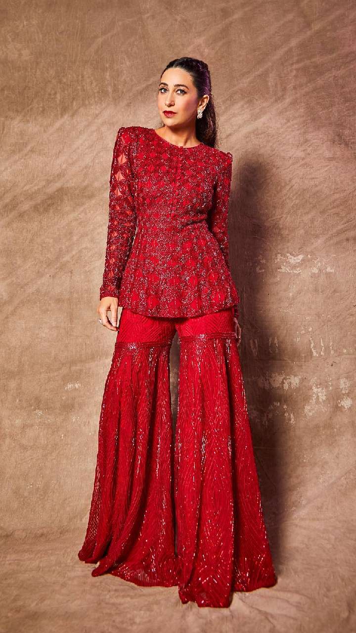 रेड कलर के हैवी वर्क शरारा सूट में करिश्मा कहर ढहा रही हैं। आजकल इस तरह के सूट काफी ट्रेंड में हैं।