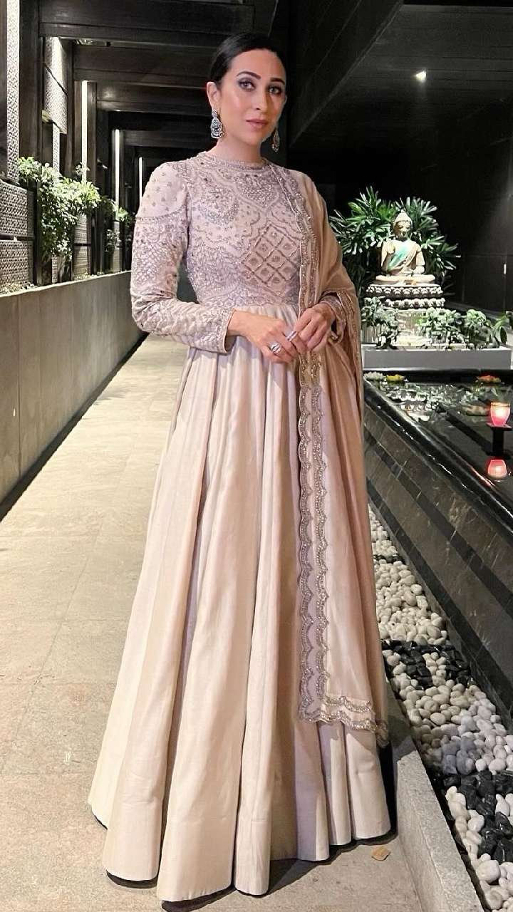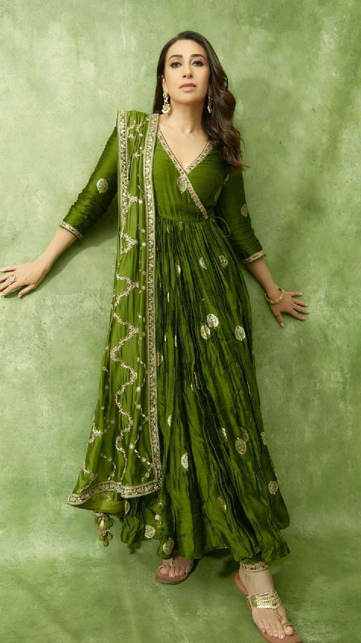 इन दिनों आलिया कट सूट भी खूब फैशन में हैं। करिश्मा मेहंदी ग्रीन सिल्क आलिया कट सूट में ब्यूटीफुल लग रही हैं।