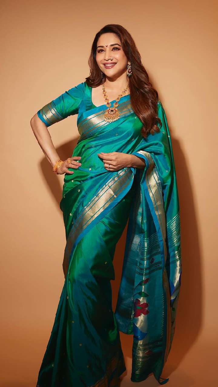माधुरी इस ग्रीन और ब्लू शेड वाली ऑम्ब्रे साड़ी वन फोर्थ ब्लाउज में काफी गॉर्जियस लग रही हैं।