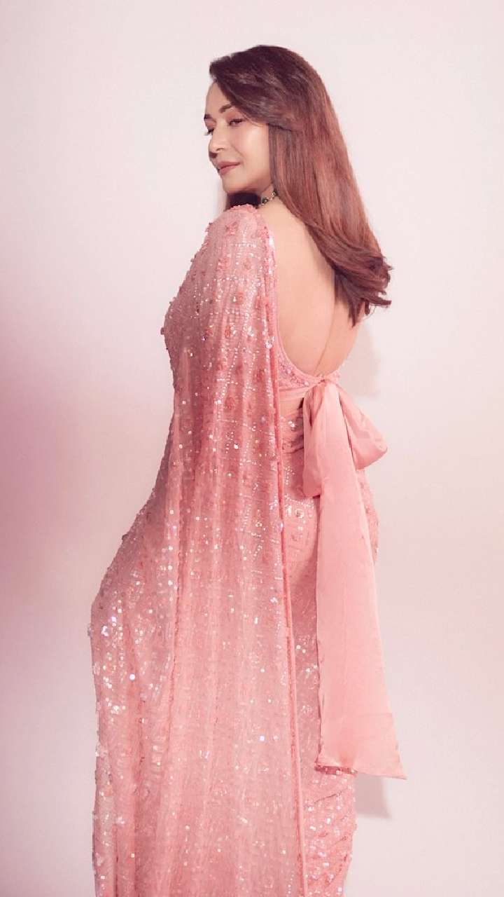 माधुरी का सेक्विन साड़ी के साथ साटन मेगा स्लीव्स ब्लाउज डिजाइन काफी बोल्ड लुक दे रहा है।