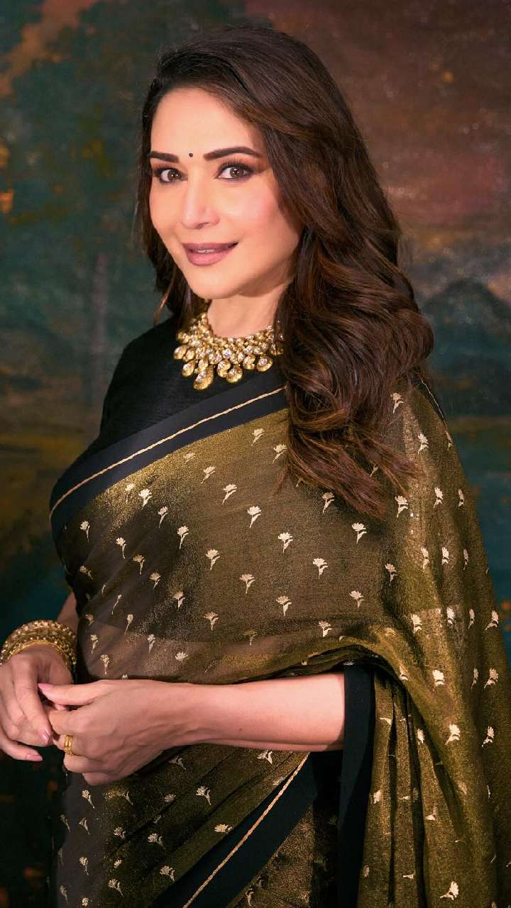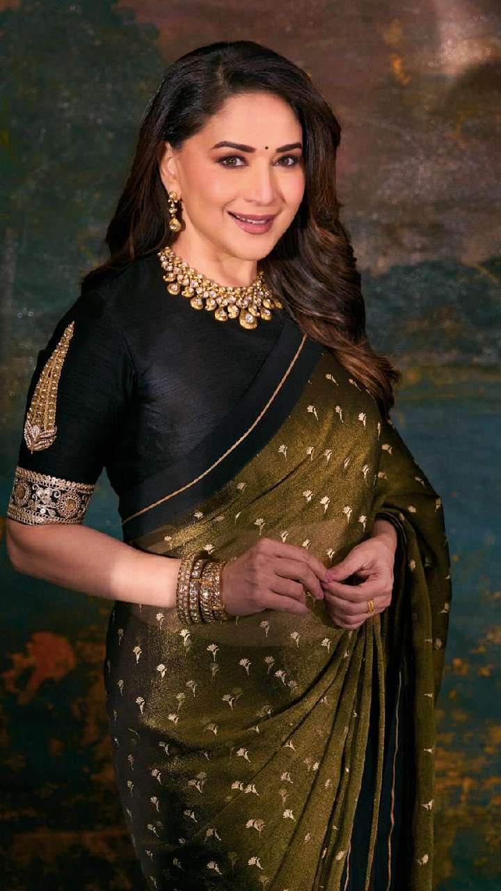 हाल में माधुरी ने ग्रीन गोल्डन डॉट साड़ी के साथ ब्लैक कलर का जीरो नेक ब्लाउज कैरी किया हुआ है। जो कि विंटर के लिए एकदम परफेक्ट रहेगा।