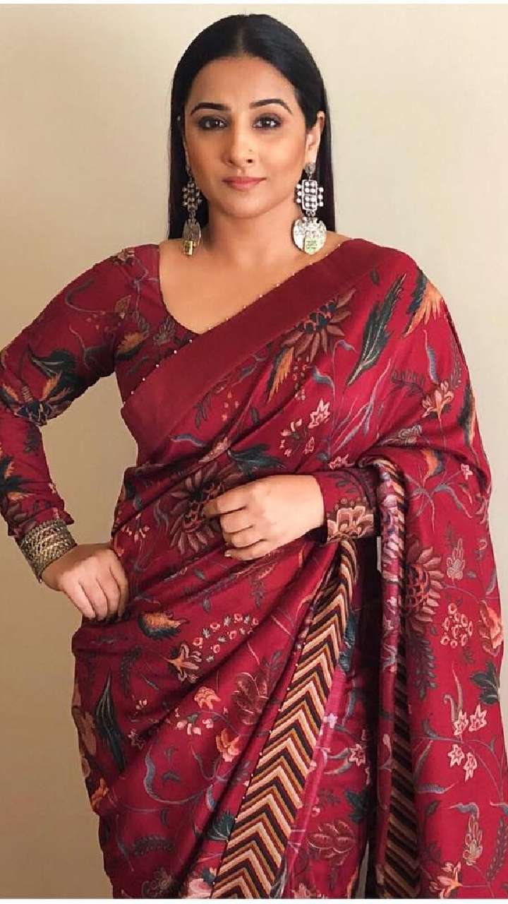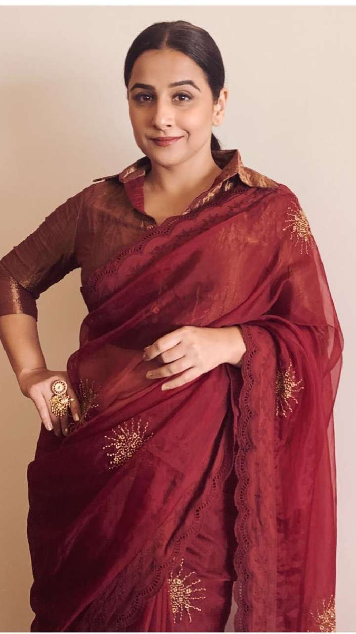 विद्या ने मरून कलर की कॉटन सिल्क साड़ी के साथ कॉलर नेक ब्लाउज कैरी किया है। जो कि विंटर के लिए बेस्ट है।