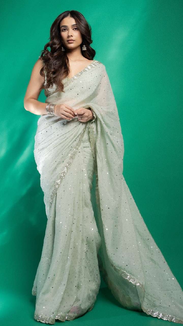 धोती स्टाइल सलवार और ब्लाउज के साथ एक्ट्रेस ने लॉन्ग और डिजाइनर श्रग को कैरी किया है। फंक्शन में हॉट लुक के लिए आप लॉन्ग सिल्वर इयररिंग्स को पहनकर रॉयल लुक ले सकती हैं।