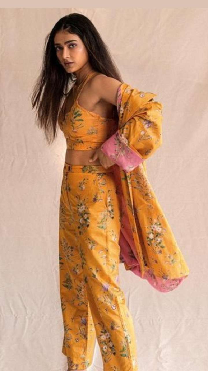 येलो प्रिंटेड पैंट्स और ब्लाउज ड्रेस में एक्ट्रेस ने प्रिंटेड ब्लेजर को कैरी किया है। पार्टी में गॉर्जियस दिखने के साथ फिगर को फ्लॉन्ट करने के लिए एक्ट्रेस के लुक को कॉपी करें।