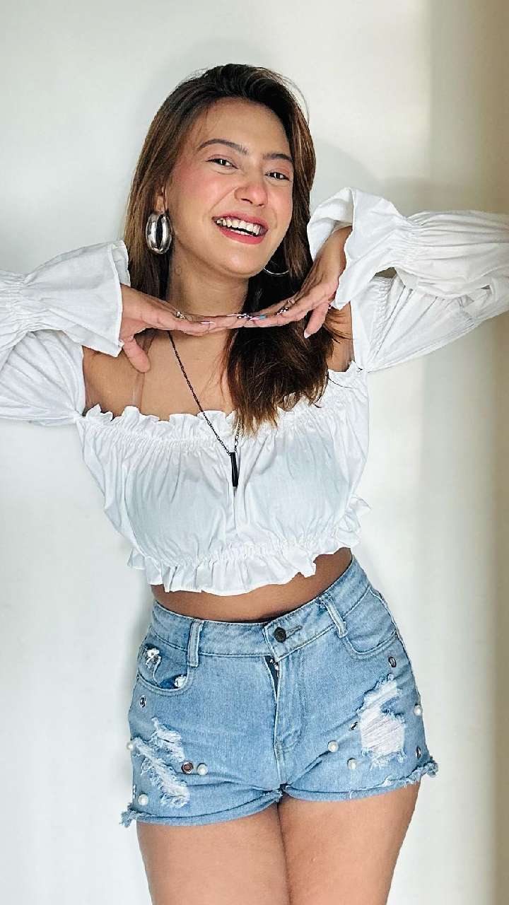 व्हाइट कलर के ऑफ शोल्डर क्रॉप टॉप के साथ आशिका ने डेनिम शॉर्ट्स कैरी किए हैं। ये लुक काफी हॉट है।