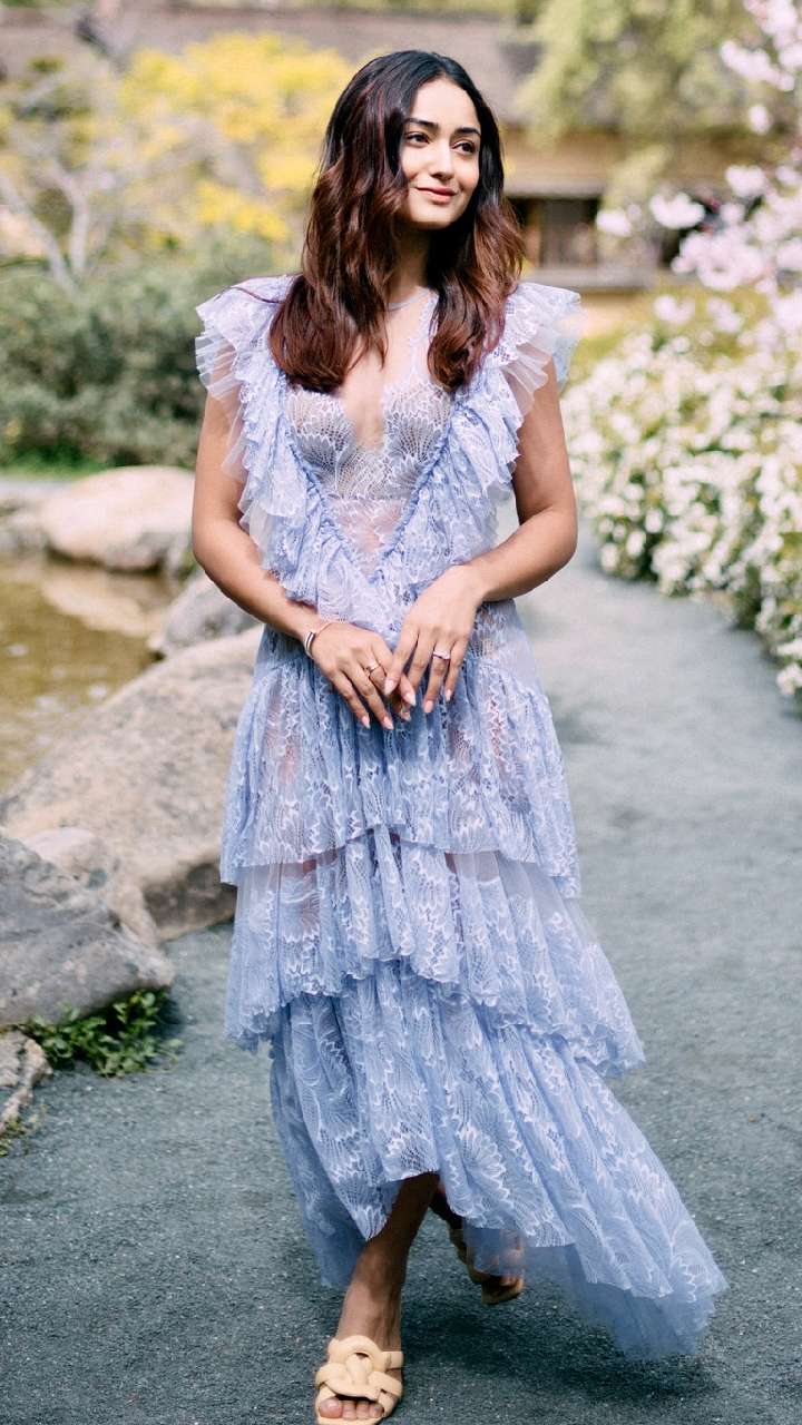 स्काई ब्लू कलर की साड़ी के साथ त्रिधा चौधरी कट स्लीव ब्लाउज पेयर किया है, जो उनके लुक को हॉट बना रहा है। आप भी उनके इस लुक से इंस्पिरेशन ले सकती हैं।