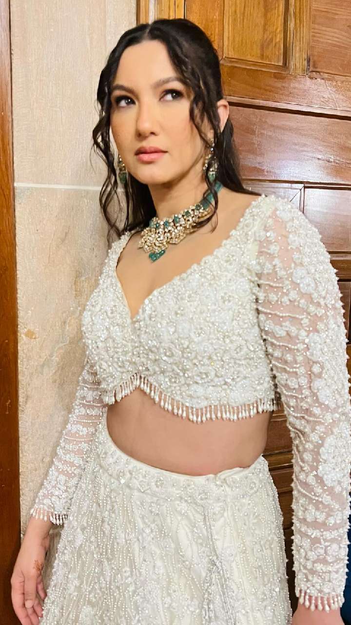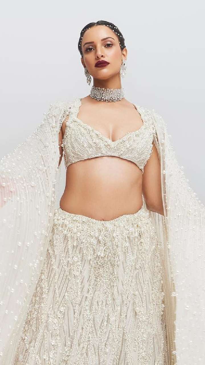 एक्ट्रेस ने लहंगे के साथ ग्लास नेक पर्ल लेयर चोली पहनी हुई है। जो देखने में काफी खूबसूरत और यूनिक लुक दे रही है।