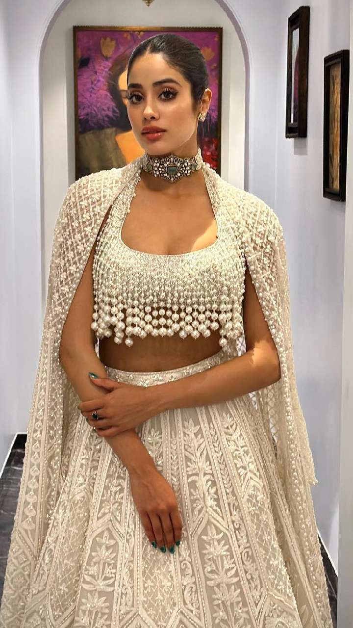 जान्हवी कपूर ने लहंगे के साथ हैवी वर्क पर्ल वर्क हेक्सागॉन ब्लाउज पहना हुआ है। एक्ट्रेस के इस लुक को आप भी कॉपी कर सकती हैं।