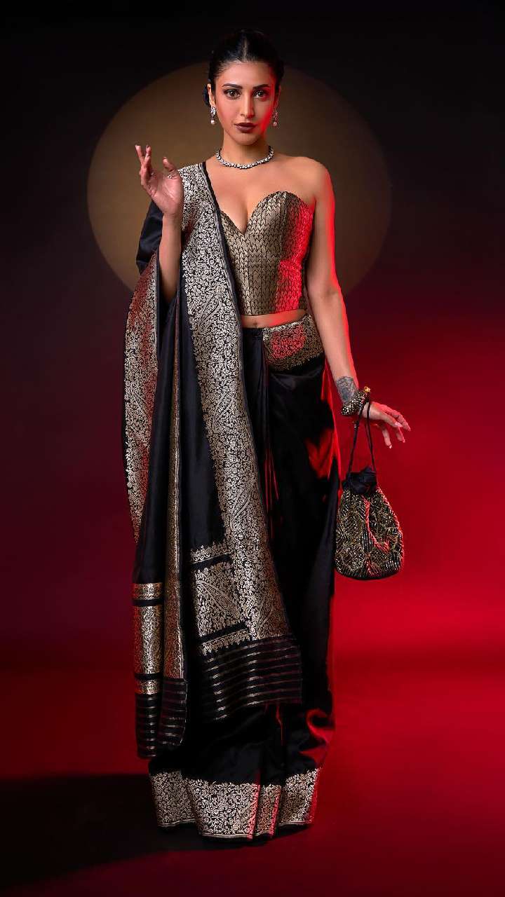एक्ट्रेस ने प्रिंटेड साड़ी के साथ प्लेन व्हाइट कोर्सेट ब्लाउज को स्टाइल किया है। आप सिल्वर ज्वेलरी और बोल्ड मेकअप के साथ ब्लाउज को नेट साड़ी के साथ भी पहन सकती हैं।